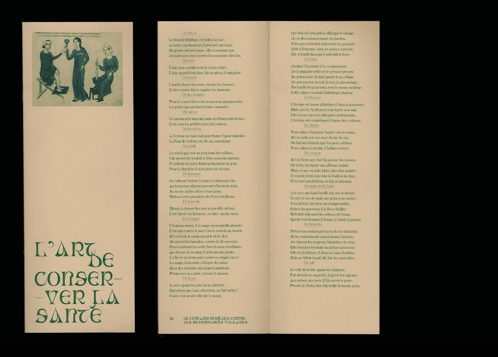 Distribuée en amont de la pièce chorégraphique d’Ondine Cloez, cette micro-édition présente une sélection de préceptes d’hygiène et de soin de l’École de Salerne (XIIIe siècle).